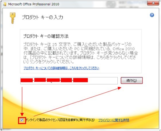 - [プロダクト キーを入力] 画面が表示されます。[プロダクト キー] ボックスにプロダクト キーを入力して [続行] をクリックします。注 : パッケージ製品の場合、プロダクト キーは Office 2010 パッケージ内部のステッカーに記載されています。詳細については、後述する「プロダクト キーを確認する方法」をご覧ください。注 : 5ケタの英数字を結ぶハイフン (次の図の赤枠部分) を入力する必要はありません。英数字のみを入力してください。注 : 正しいプロダクト キーが入力されないと [続行] ボタンが有効になりません。次のようなメッセージが表示された場合は、入力されたプロダクト キーに誤りがある可能性がありますので、再度プロダクト キーが正しく入力されているかどうか確認してください。これは、有効な Office プロダクト キーではありません。詳細については、上記の例を参照してください。